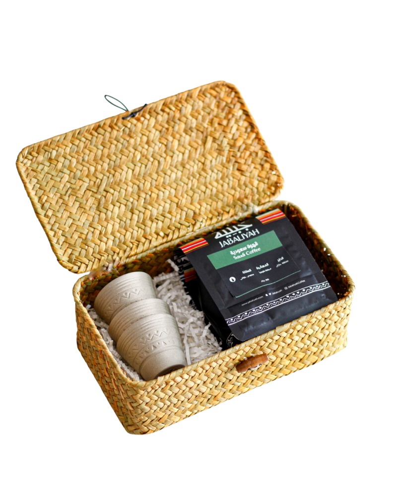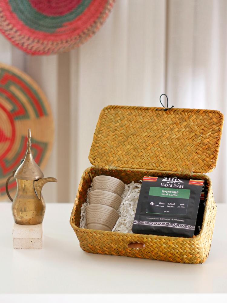 لنقدم هدية سعودية في صندوق محبوك يدوياً يحتوي على ثلاثة فناجين بنحت نقوش الماضي وقهوة سعودية خولانيه من الموروث الأصيل.